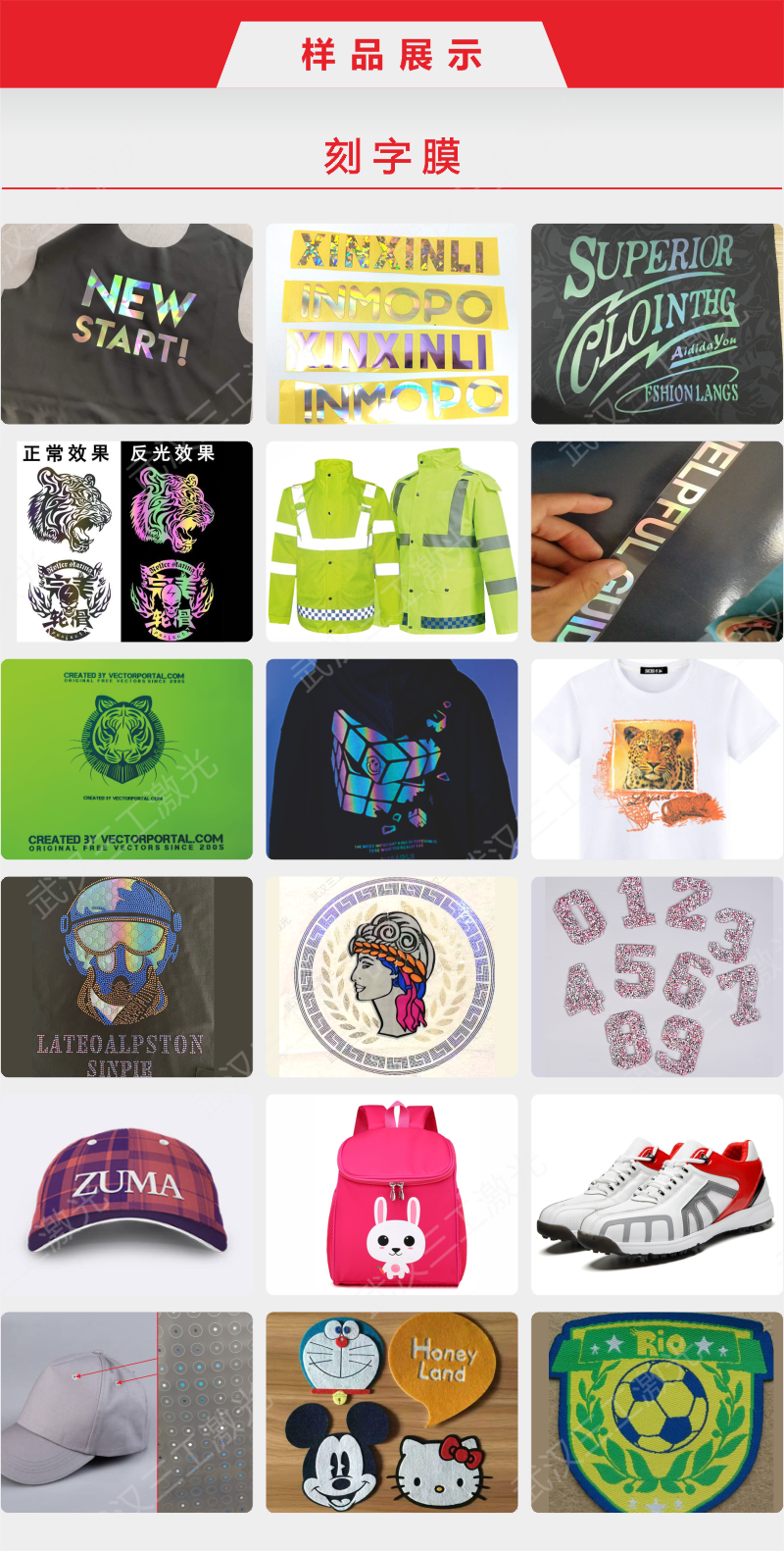 1、服装辅料加工行业,如PVC刻字膜、TPU刻字膜、PU亚光刻字膜、夜光刻字膜、镭射软金属刻字膜、喷绘打印膜、反光刻字膜、植绒刻字膜、金葱刻字膜、反光丝印膜、弱溶剂打印膜、装饰膜、皮标、布标等材料。