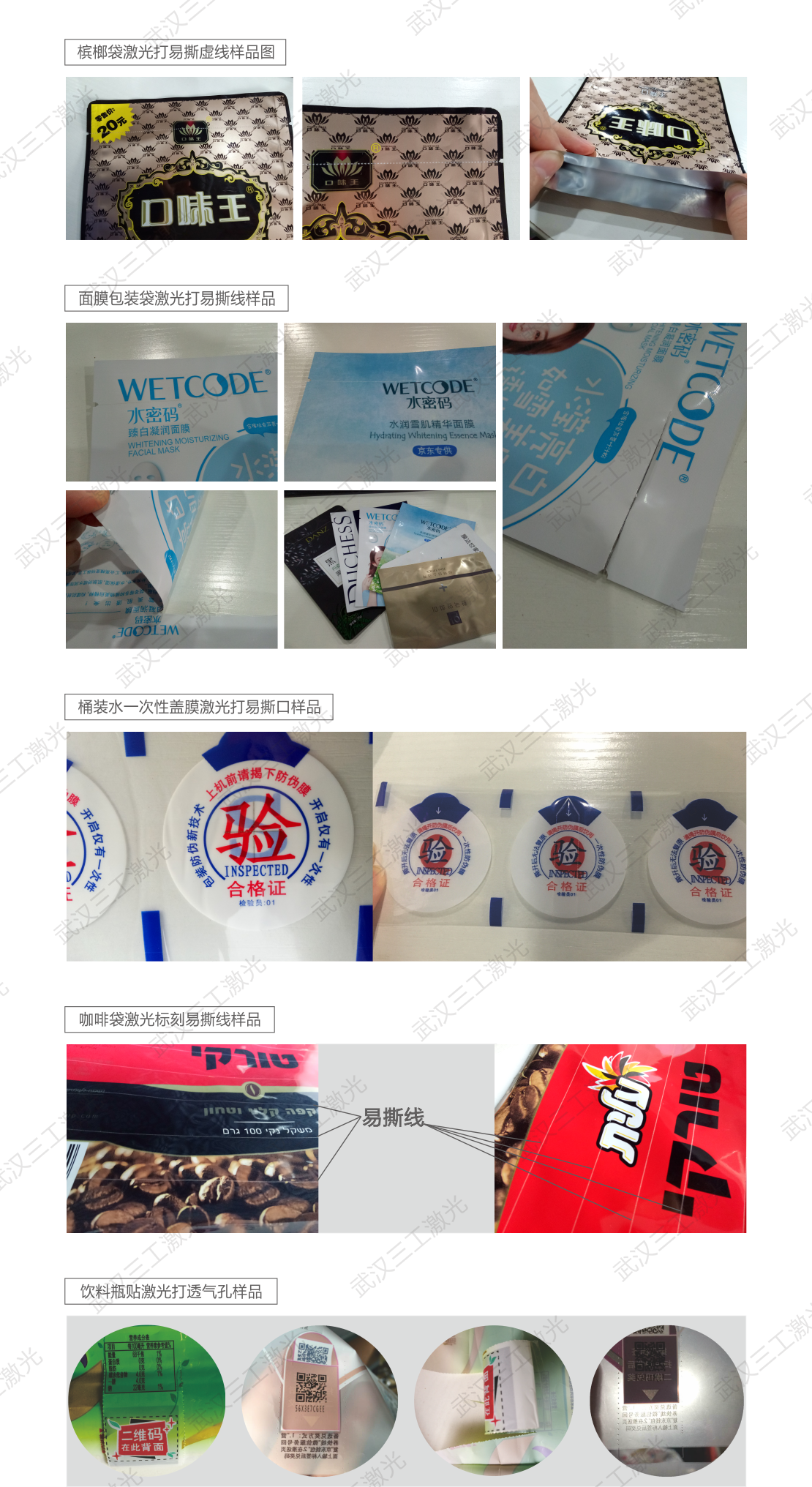 武汉中欧体育激光是国内率先针对薄膜包装行业提出激光代替机械加工工艺的企业,专为薄膜易撕线、定量透气孔而设计与开发的。与传统的机械齿轮压孔相比速度更快,孔径孔距大小可调更加均匀,可以实现任意方向任意形状易撕孔(线)标刻。激光工艺制作是一种瞬间高温处理使孔周围热融保护,因此完全解决了后期热收缩后出现的断裂现象,在手感上也非常平滑,在感官上给客户一种新的体验。激光易撕线和透气孔的诸多优势我们前面已经讲到过很多,再次不做赘述,下面一起来看一下我们易撕线激光打孔划线机做的不同行业以及材料的样品吧!